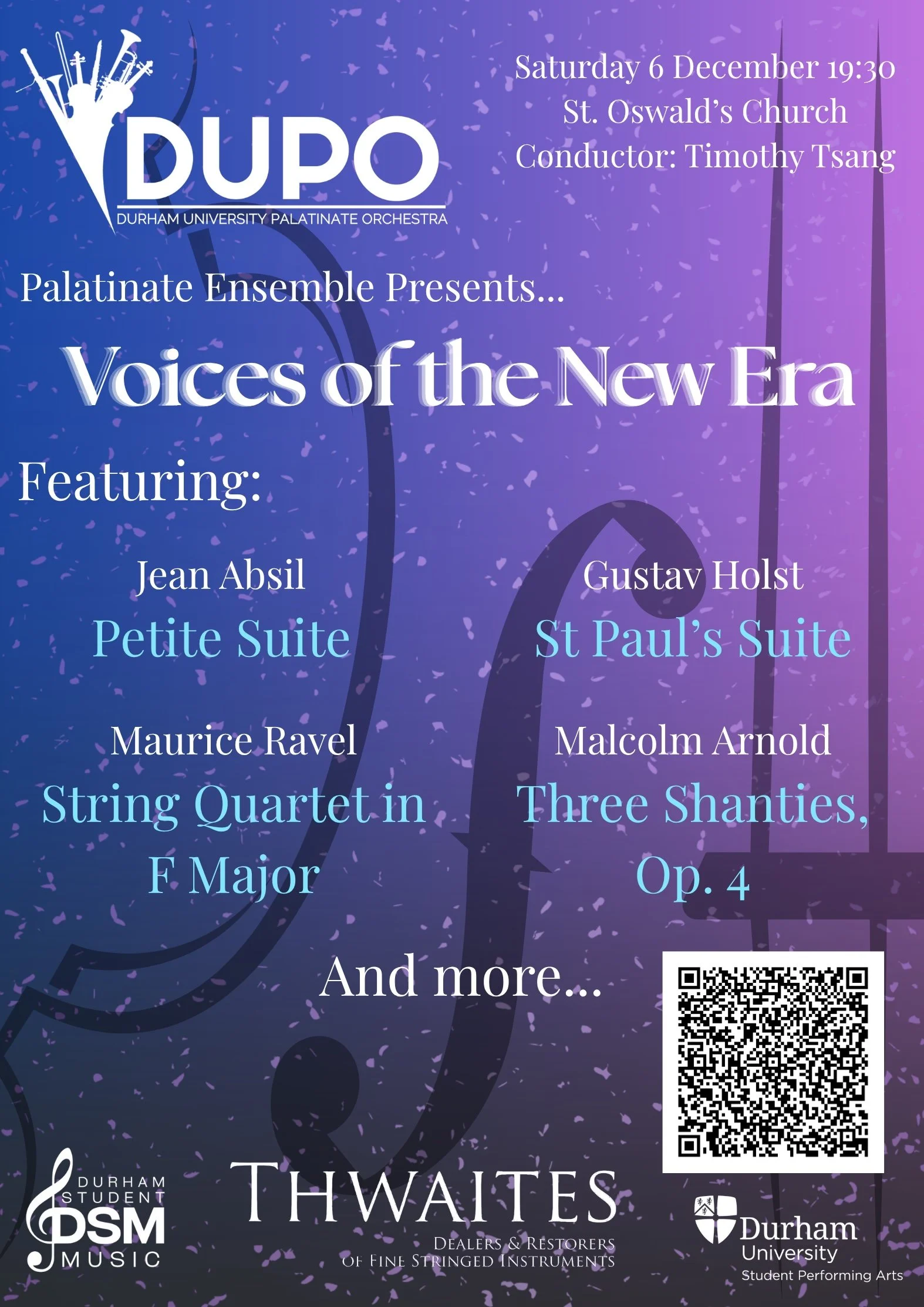 Durham University Palatinate Orchestra’s Palatinate Ensemble warmly invites you to their season-opening concert, ‘Voices of the New Era’, for an evening of vibrant and inspiring music making. Led by conductor Timothy Tsang, the 20-piece chamber orchestra will explore the sound world of the 20th century, performing ‘Petite Suite’ by Belgian composer Jean Absil and ‘St Paul’s Suite’ by English composer Gustav Holst. The concert will also feature performances by smaller ensembles.